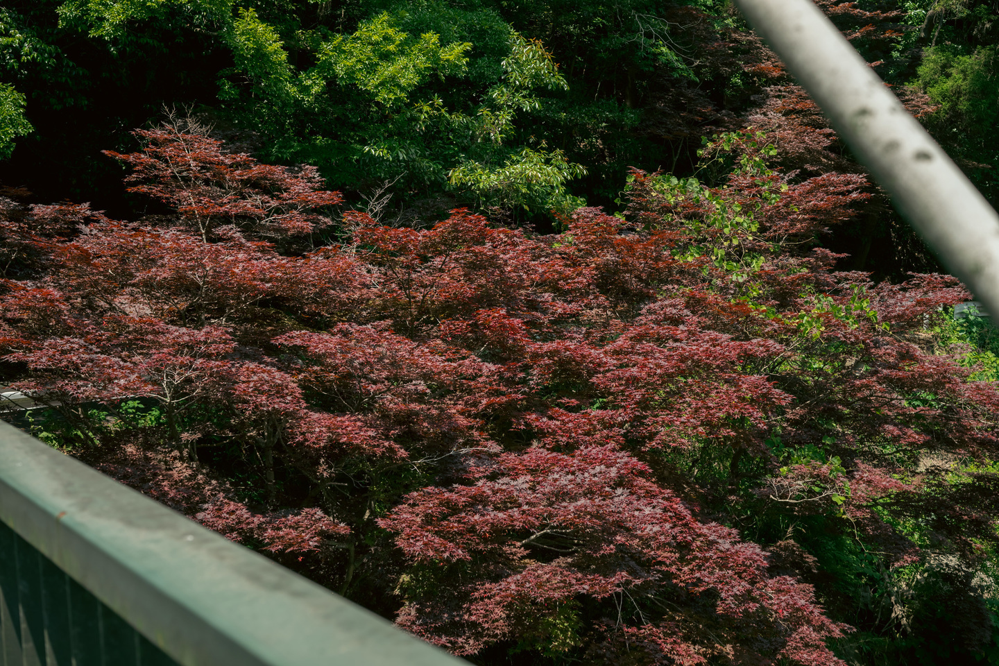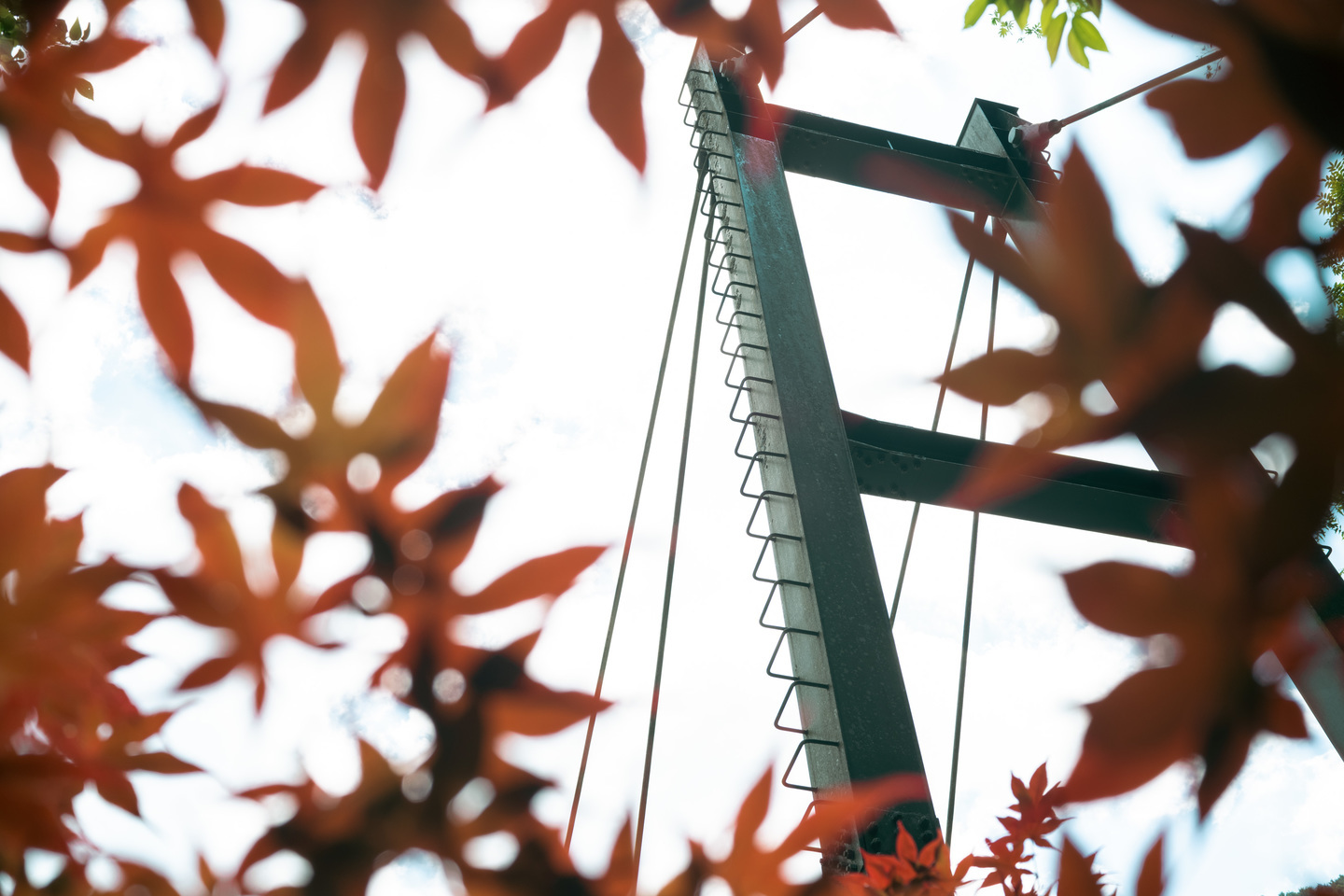 いろは紅葉の隙間から見える塔、階段の段数を数えてみる。真っ直ぐに伸びたケーブルが斜張橋をしっかりと支えている。