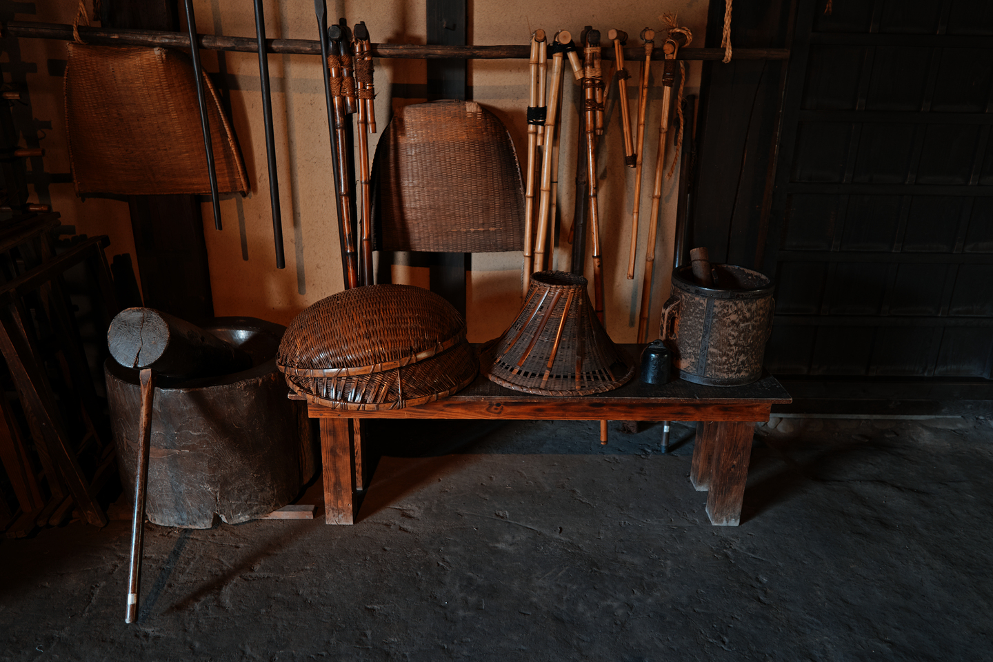 古民家の土間に置かれていた農機具を絞り開放で。F1.4の明るさは、このような薄暗いシーンで活躍する。開放でのカットだが、農機具の素材感がとてもいい。長い間使い込まれた道具のリアイリティが伝わってくる