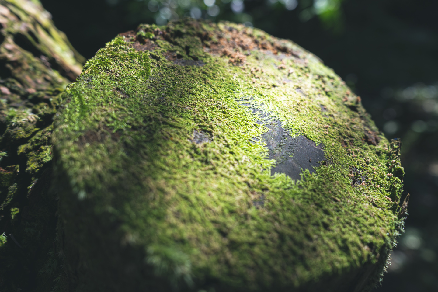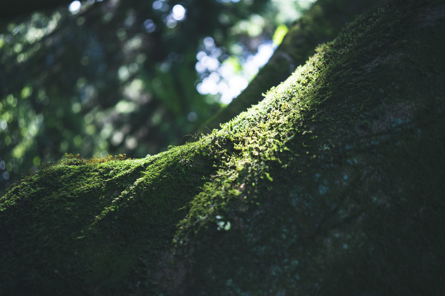 『月面着陸』苔むした木の幹を細い足の蜘蛛が、まるで無重力かのようにゆっくりと移動する。私も重力を無視して斜めにカメラを構えてみた。苔の質感や蜘蛛の細い足を繊細に描写している、絞りは開放f2だ。