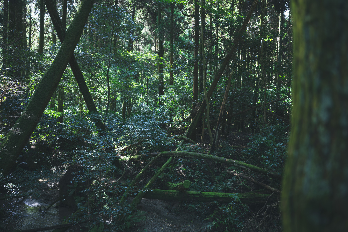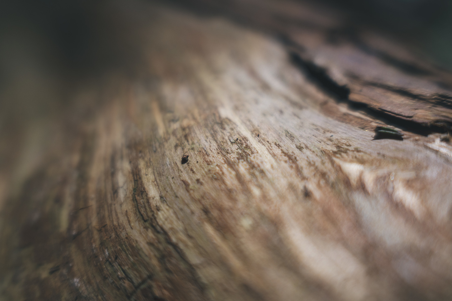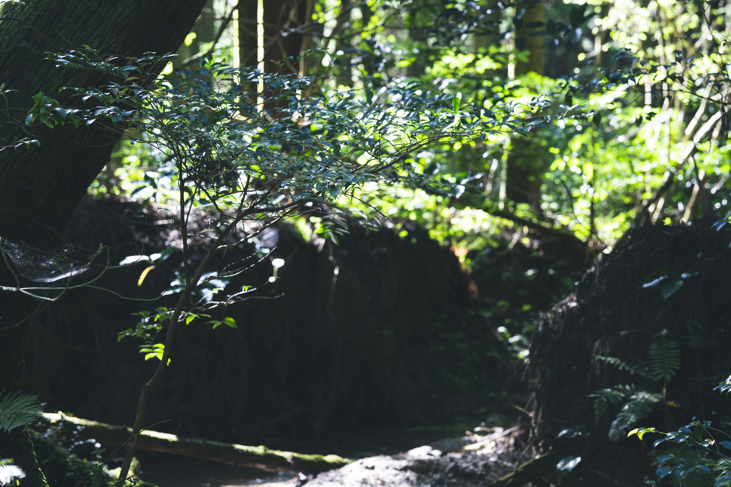 『猫バスのドア』木の幹の隙間から差し込む光がバスの扉のような形に見える。こちらの写真も開放絞りのf2だが、周辺までとても繊細な表現をしてくれる。