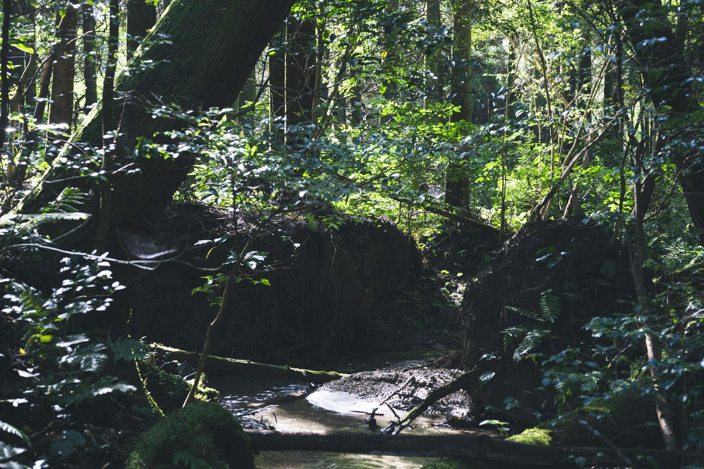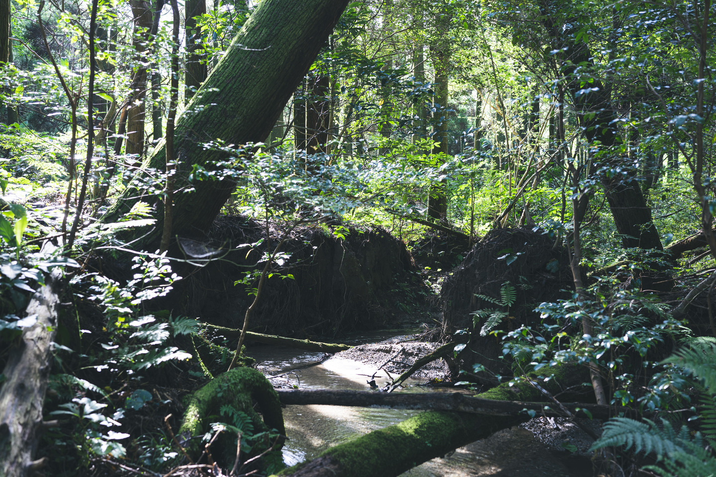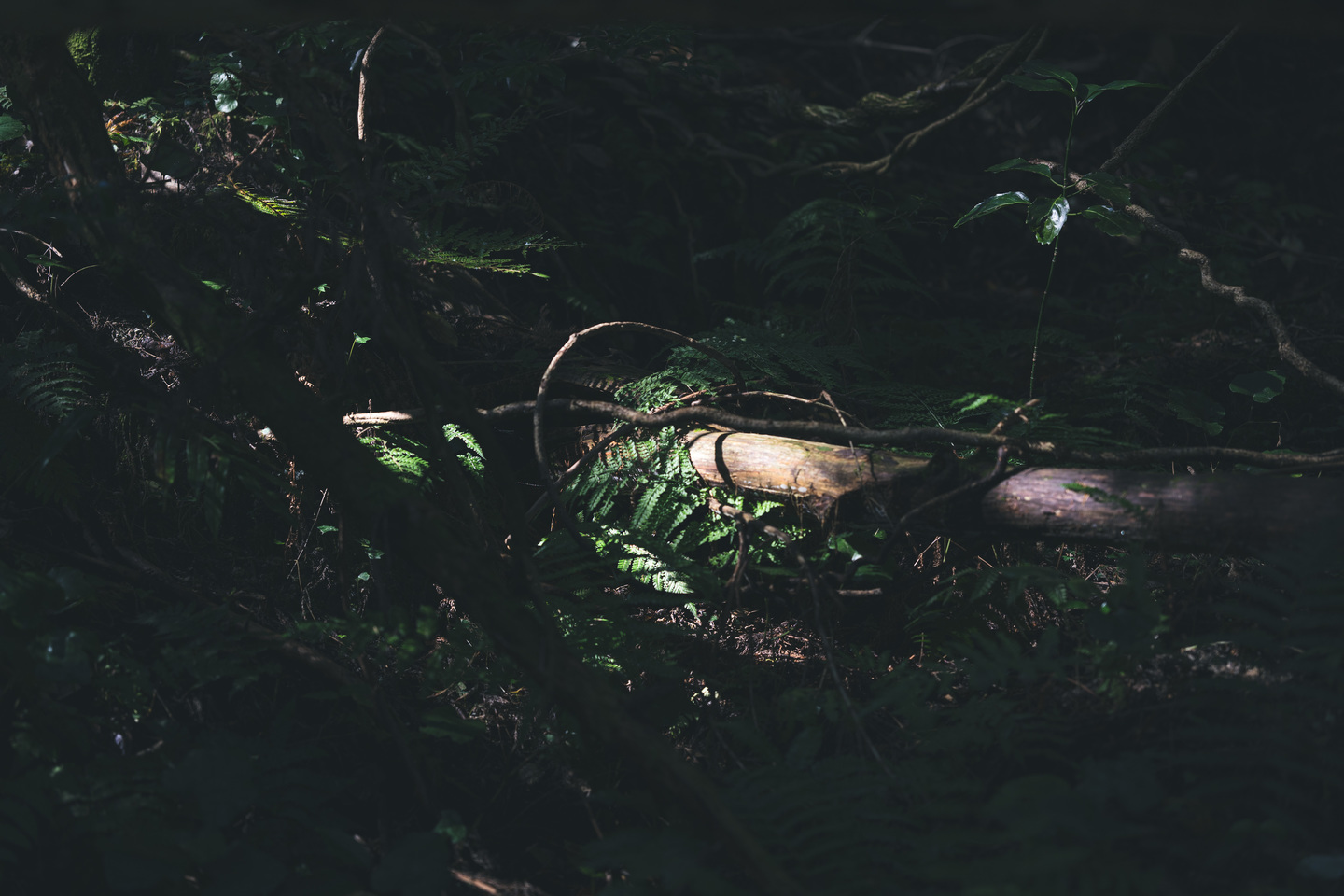 『猫バスのドア』木の幹の隙間から差し込む光がバスの扉のような形に見える。こちらの写真も開放絞りのf2だが、周辺までとても繊細な表現をしてくれる。