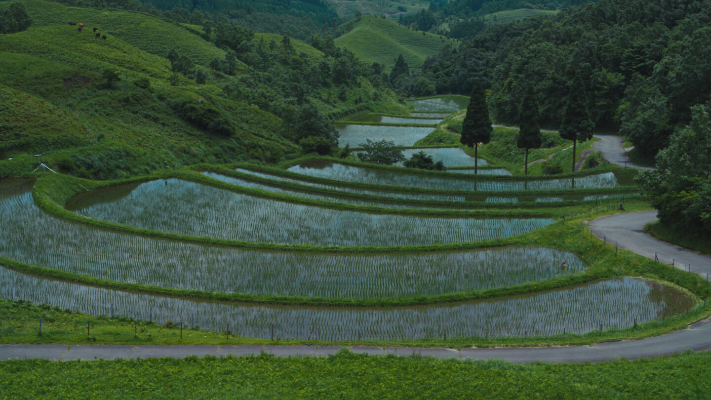 丘の中腹、すでに扇状に広がる棚田がみえた。広角端70mmで撮影。空が映った水面に、田植えしたばかりの苗が整然と並ぶ。透明感のある水と、細かな牧草や苗が緻密に描写されている。周辺もしっかりと解像されていて甘くなることもない。