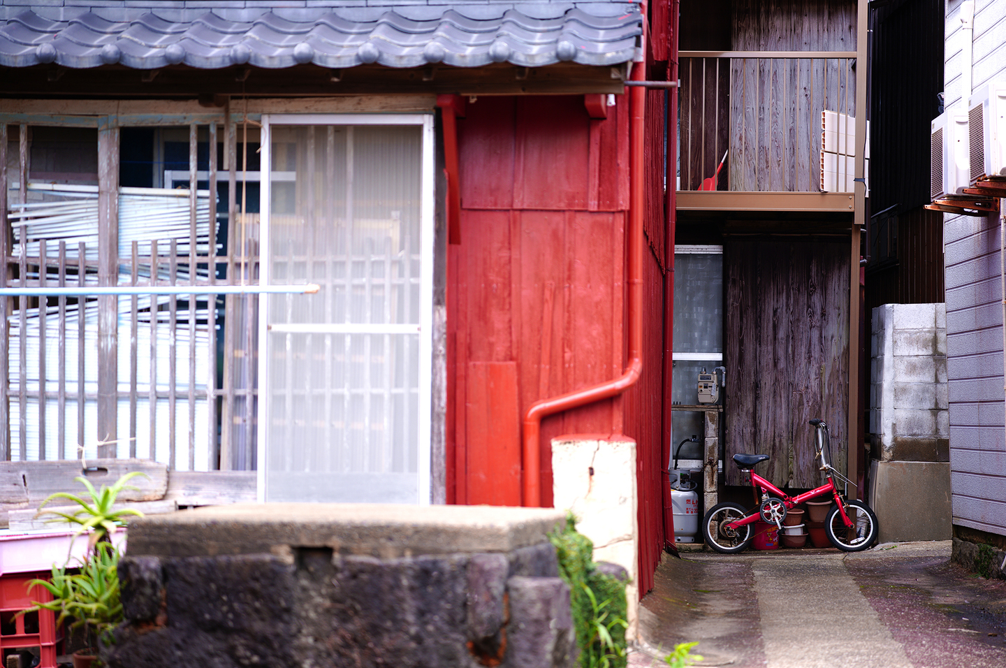 90mmという焦点距離は、風景のように広くは撮れないし、かといって、望遠レンズのようでもなく、難しいと感じる人も多いと思いますが、実は、スナップの切り撮り撮影に最適なのです。この写真のように、路地裏の一部を切り取り、赤の自転車にピントを置き、画面の中に他の赤色のもの(赤い壁、赤いビール箱、赤いほうき)などを入れ込み、画面のバランスを整えます。