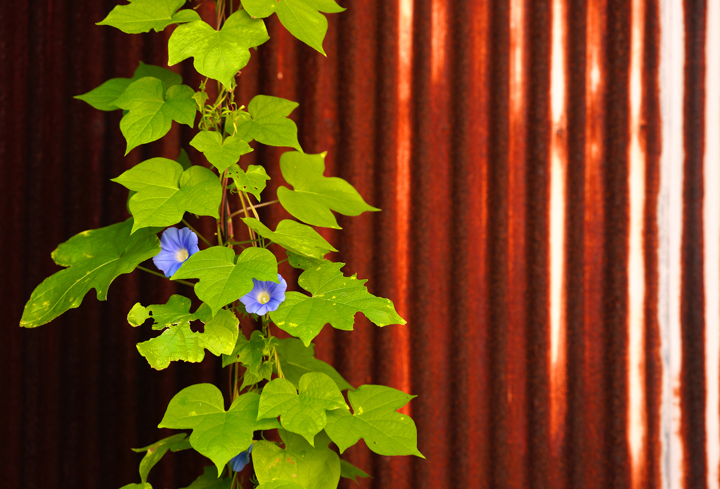 また、この朝顔の写真のように、朝顔だけをアップで撮るのではなく、朝顔の花弁の柔らかさと対照的に、錆びたトタンの壁を入れ込み、手で感じるような硬さと柔らかさの触感を表現するのも楽しいです。