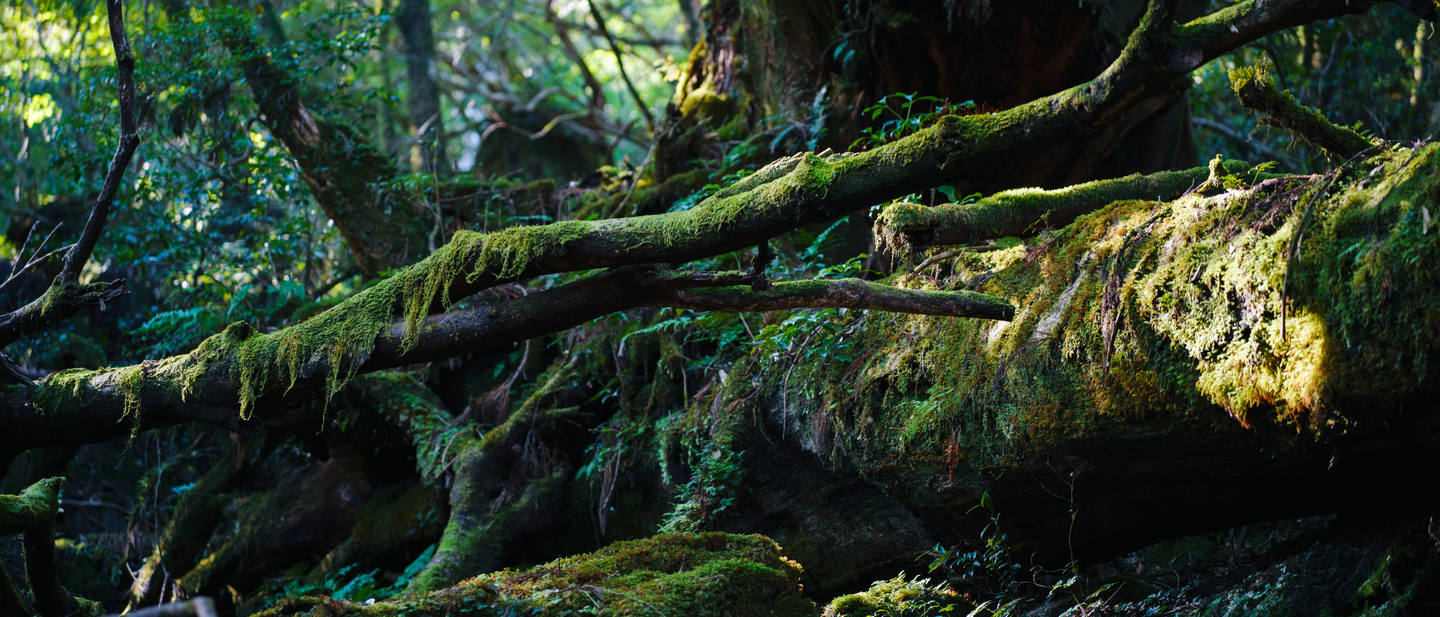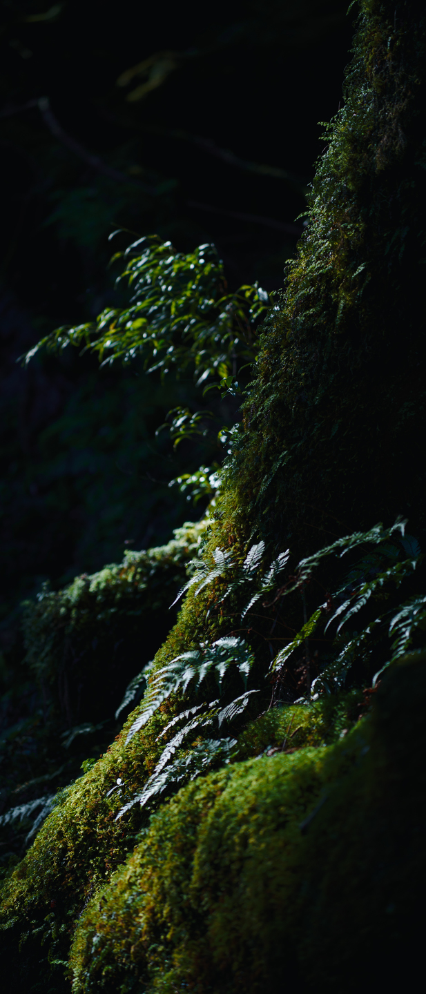木に生えた苔が木漏れ日で優しく照らされていました。朝露で濡れたしっとりとした雰囲気も写真に収めることができました。地面ではなく木の根からも新たな葉っぱが次々と生えているのは、自然の力強さを感じます。