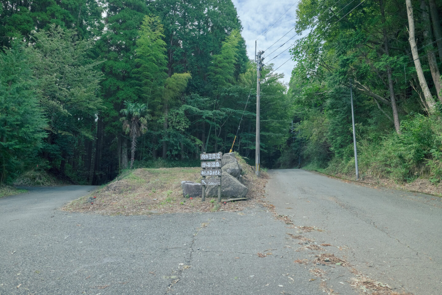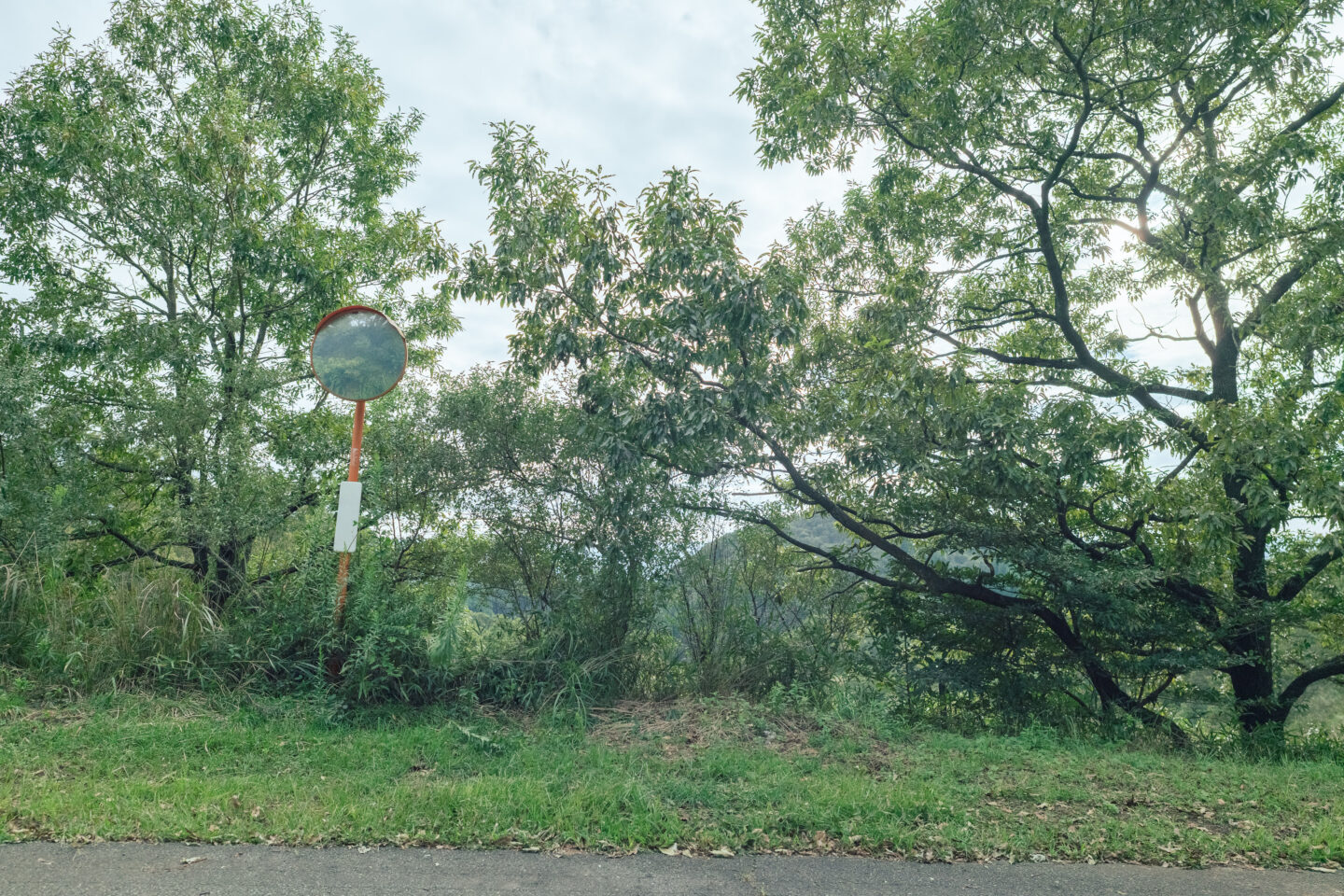 細い山道を対向車に気をつけながらゆっくり進んでいくと、丘の上にバンガローが立ち並ぶ雰囲気の良い集落があった。写真を撮りたかったが、ここはそのまま進むことにした。カーブミラーが立っている辺りで景色を見渡せそうだったので、車を停める。