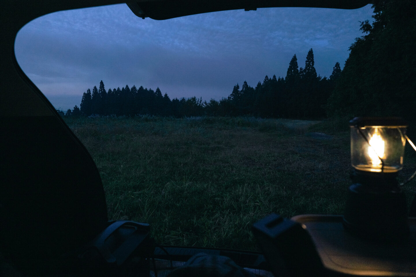 ランプの灯りを頼りにコーヒーを淹れて車内でゆっくりと過ごす。少し怖く感じるほどの静寂だが、慣れると心地よい。今夜は音楽をかけずにゆっくりと過ごそう。