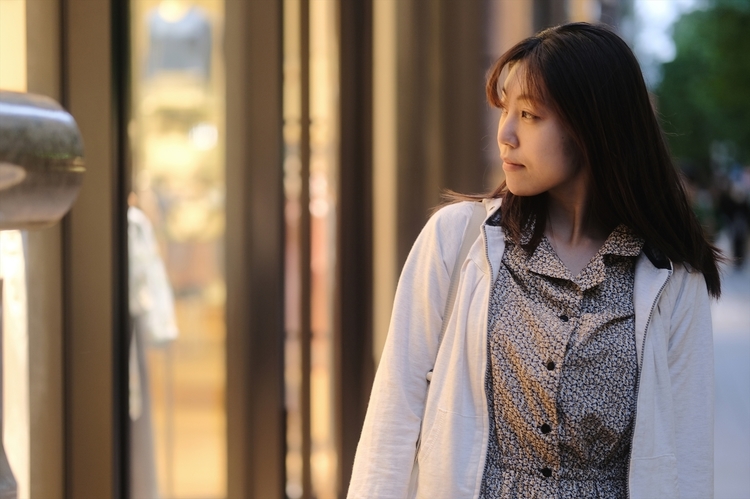 夕暮れ時、日が落ちてきて薄暗く、安定しにくい光となる時間帯はショーウインドウの灯りを活かし、歩きながらのポートレートスナップ。こうした限られた光量で撮影するときにも開放F値の明るさが心強いです。立体感を生み出す背景の奥行きで街の雰囲気を取り入れながらモデルさんの自然な表情を捉えました。人工光なので、ブラックミストフィルターで柔らかい雰囲気をプラスしています。