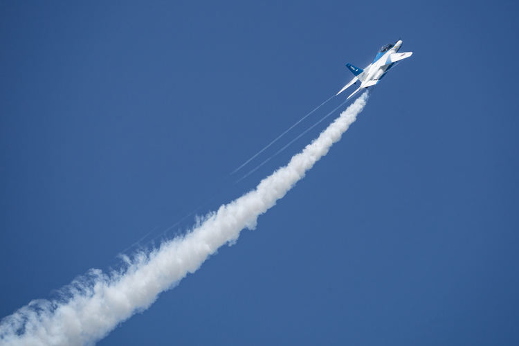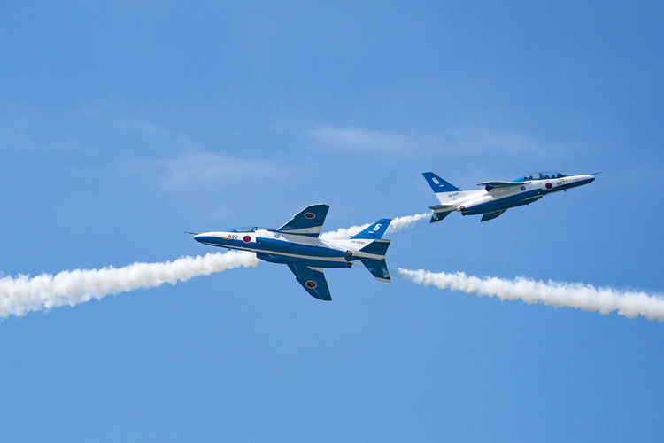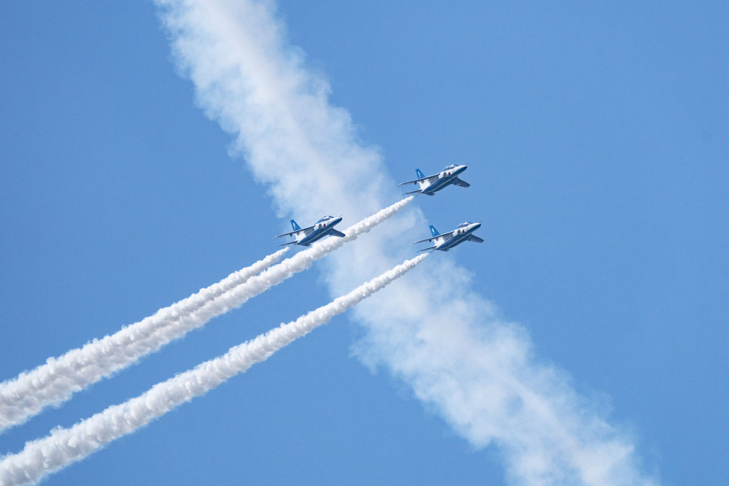 また快晴の青空であれば、少し引いてブルーインパルスのスモークの軌跡を画面いっぱいに入れて表現するの良いのではないでしょうか。