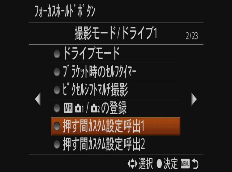 例えば、筆者の場合はこんな設定をレンズについている「フォーカスホールドボタン」に割り当ています。これでファインダーを覗きながら右手はシャッターボタンに集中し、左手でレンズを支えながら「フォーカスホールドボタン」を押したり、離したりして高速シャッター撮影とスローシャッター撮影を切替えて撮影しています。