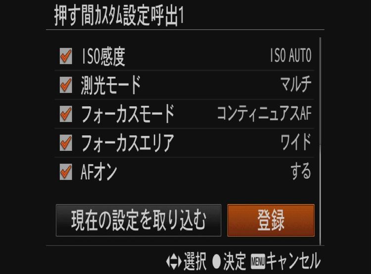 設定方法は簡単です。最初に登録したい撮影設定にカメラを設定していきます。撮影モードやホワイトバランス、ISO、AFエリア、瞳AFの設定などなど。一通りに設定したら、メニューキーから「MR 撮影設定 1/ MR 撮影設定 2の登録」を選択します。