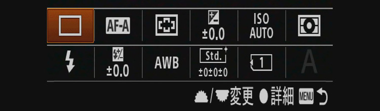普段の撮影で一番よく設定変更に使用するのが、このFn(ファンクション)メニューではないでしょうか?ここには普段の撮影によく使われるだろう設定変更項目が12個登録されています。