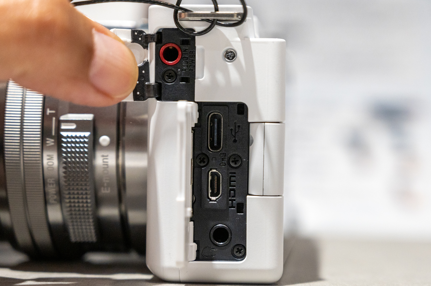 また撮影中、バリアングル液晶が干渉しづらい位置(指でカバーを開いている位置)にマイクロホン端子が装備されており、より指向性の高いガンマイクや、離れた演者の音声を記録できるワイヤレスマイクを装着できるようになっています。