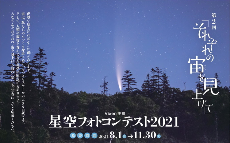 ビクセンでは第2回「それぞれの宙を見上げて」星空フォトコンテスト2021を開催しています。宙(そら)は、もっとも身近にある、スケールの大きな被写体です。満天に星の広がる高原や海辺から、歴史的な建造物とともに、都会の景色の中で、あるいはご自宅からも、星空を撮影することができます。みなさんの「宙を見上げる時の想い」を、ぜひ作品にしてご応募ください。お一人何点でもご応募可能です。