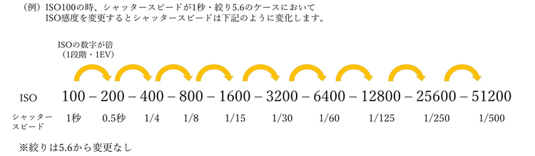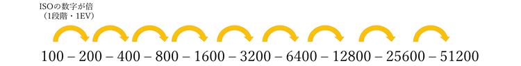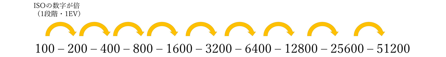 ISO感度変更の恩恵は、主にシャッタースピードをコントロールできることだと考えて良いでしょう。下記はISO感度の系列を表したものです。