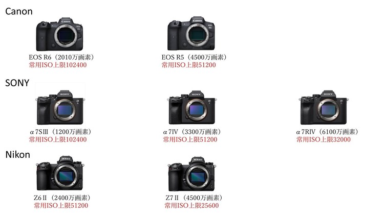 以下は現在発売されている代表的なフルサイズセンサー搭載のカメラです。同じメーカーでも画素数が少ない程、常用ISO感度が高くなり、画素数が多いほど常用ISO感度が抑えられていることがわかりますね。なお、拡張ISO感度領域ではさらに高い数値も設定可能ですが画質が相当落ちてしまいますので、あくまでも非常用だと割り切って考えるのが良いでしょう。