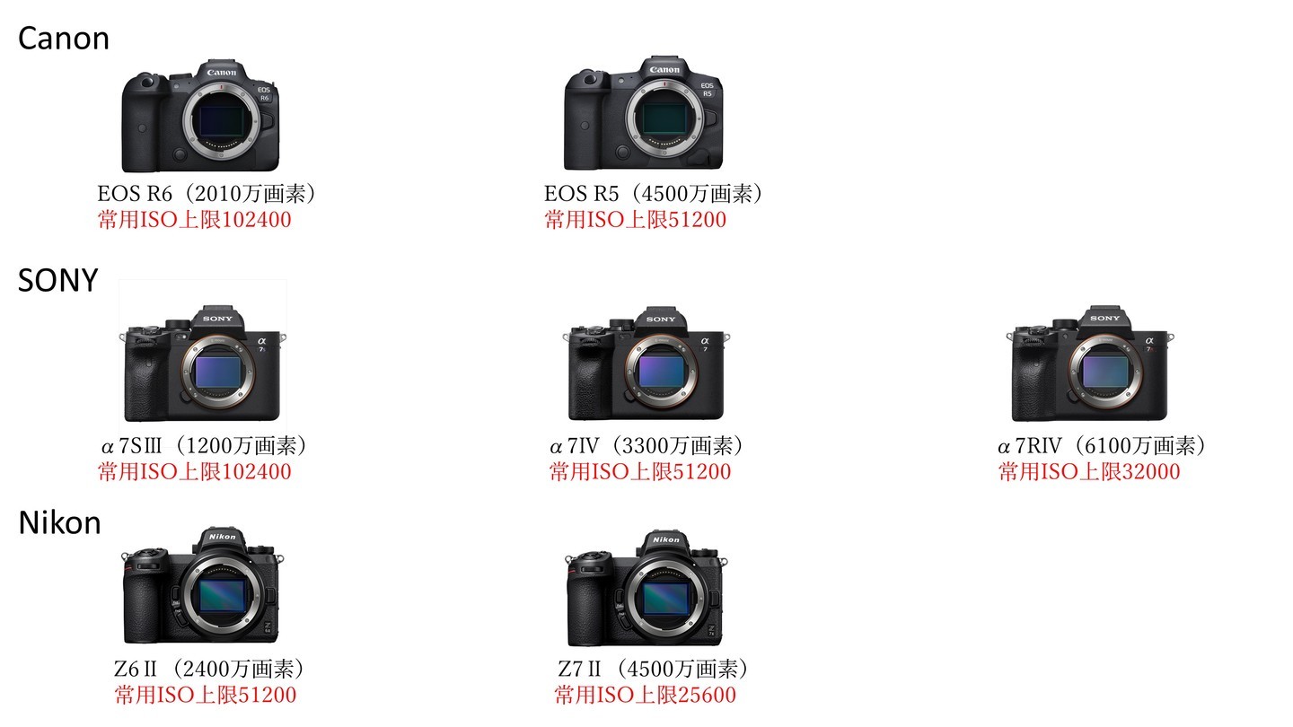 同時期に発売されたカメラで比較すると、一般的にはセンサーサイズが大きく、画素数が少ないカメラほど高感度に強く「暗い場所での手持ち撮影が多い」「高速シャッターを多用する」など、高感度性能を優先させたいならフルサイズ以上のセンサーを搭載したカメラの中から、さらに常用ISO感度の上限が高いものを選ぶと良いでしょう。