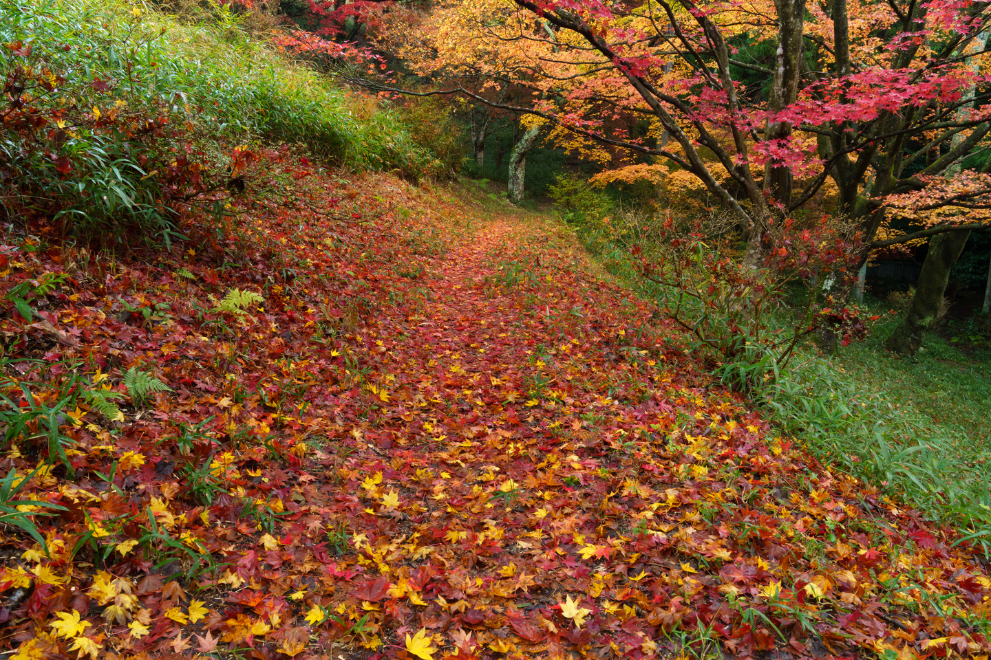 雨上がりの朝、落葉が乾かないよう薄暗いうちに撮影。パンフォーカスのため絞り込んでいるのでシャッタースピードが相当遅くなるが三脚を使えばISO感度を上げずに撮影できる。後に述べるが、ISOがオートになっていると三脚を使用しているにも関わらず無駄にISO感度が上がってしまうので注意。