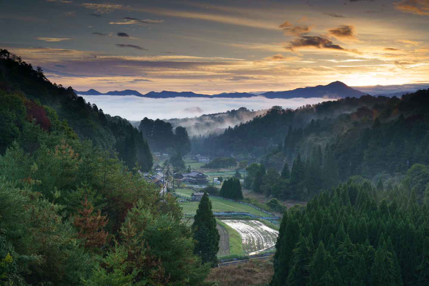 雲海たなびく里山風景を狙う。輝度差のあるシーンにおいて高感度で撮影、後からシャドウ部を明るく持ち上げるとノイズが出やすくなることがある。レタッチを想定する場合も無駄に感度を上げる事は避け、基本的には三脚を使う。