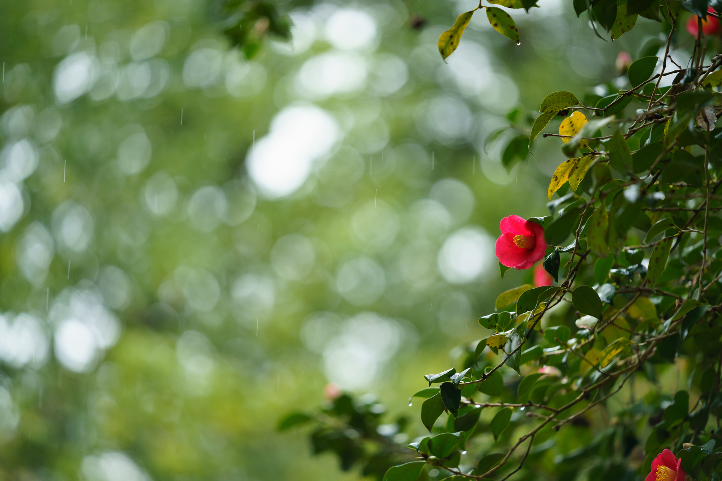やや風がある状況で、椿の花が被写体ブレをおこす可能性があったためISOをやや高めの800に設定した。雨の線の長さもシャッタースピードによって変化する。