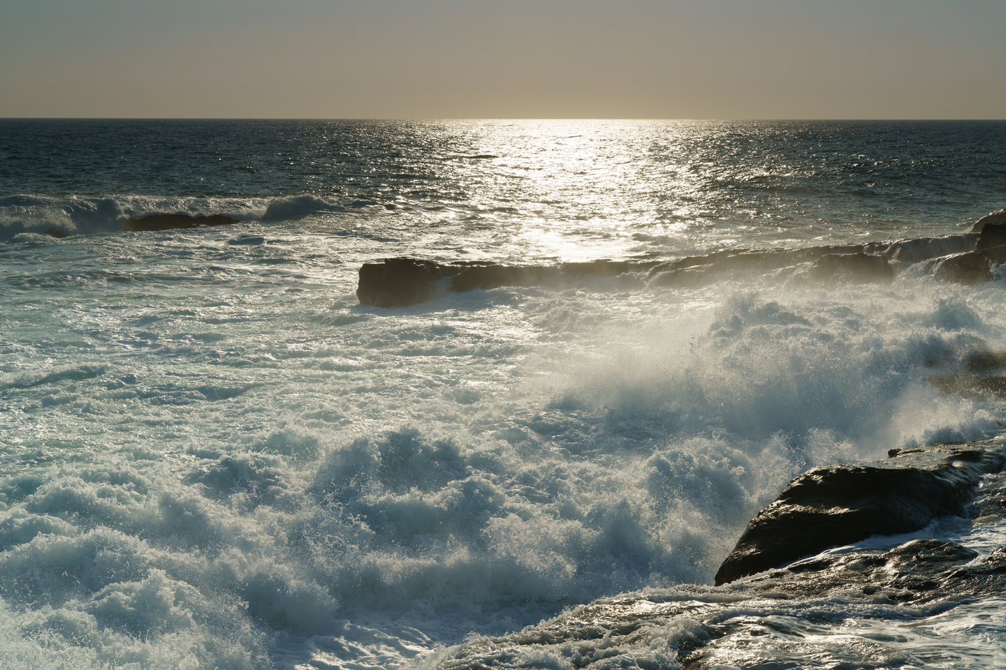 荒々しく押し寄せる波しぶきを高速シャッターで写し止めた。このような明るい状況であれば少々絞ってもISO感度を上げずに速いシャッターが切れる。