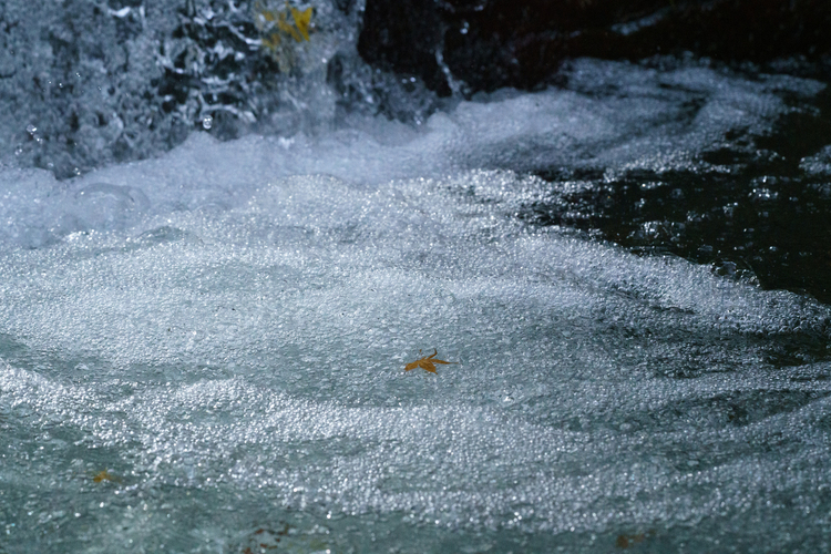 上流より流れ込んでくる落葉に素早くピントを合わせて撮影。超望遠域400mmでの撮影のため被写界深度確保のため絞っているが、1枚前の写真よりさらに暗い状況。水の流れは案外早いのでさらに感度を上げてしっかりと落葉を写し止めた。ISO6400に設定しているので高感度ノイズの発生が見られる。とは言え近年のカメラの高感度性能は素晴らしく実用に耐えうる画質だ。
