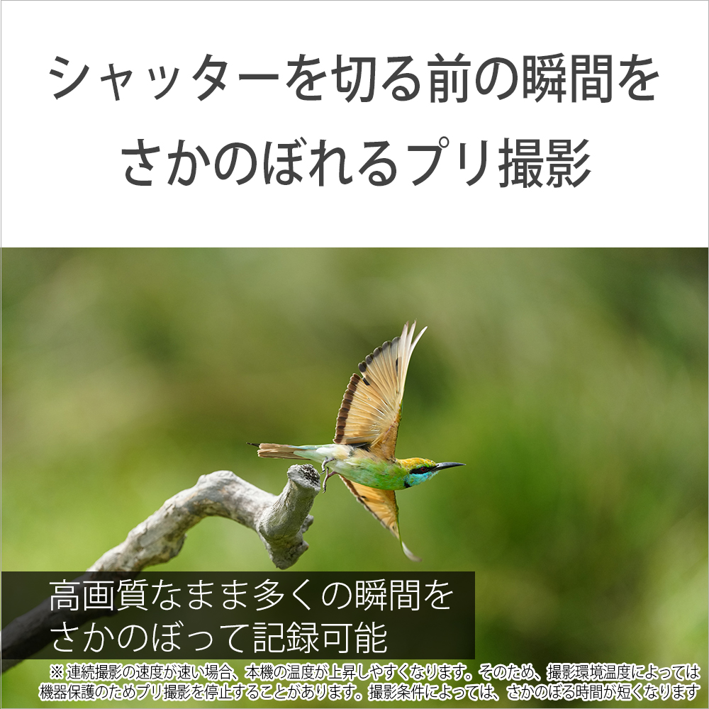 有効約5010万画素のメモリー内蔵フルサイズ積層型CMOSセンサーExmor RS(エクスモア アールエス)と最新の画像処理エンジンBIONZ XR(ビオンズ エックスアール)の組み合わせにより高い描写性能を実現し、APS-C画角にクロップした際でも約2100万画素の高解像の画像を撮影できます。ブラックアウトフリーでのAF/AE追従最高30コマ/秒の高速連写中も、最大120回/秒のAF/AE演算により複雑な動きに追随します。また最大1秒前までさかのぼって撮影が可能なプリ撮影機能も搭載しています。