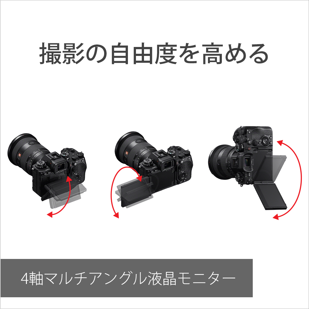 3.2型の液晶モニターは、自在に角度を調整できる4軸のマルチアングル。「α1」からシャッターボタン、カスタムボタンの位置などを改善しているため、撮影の自由度をより高めるでしょう。また、縦位置用のグリップ『VG-C5(別売り)』で長時間の撮影もサポートできるシステムになっています。