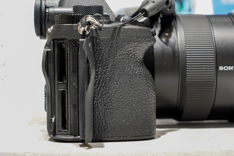 記録メディアはSDメモリーカード(UHS-I /II対応)とCFexpressカード(Type A)に対応したデュアルスロットで、CFexpressカードは上側のSLOT 1のみで使えるようになっています。
