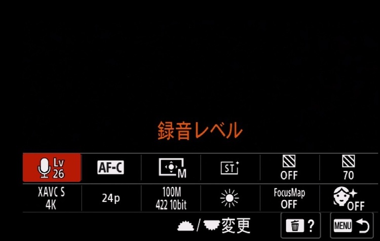 録音レベル / フォーカスモード / フォーカスエリア / クリエイティブルック / ゼブラ表示 / ゼブラレベル