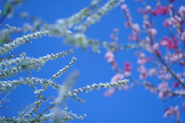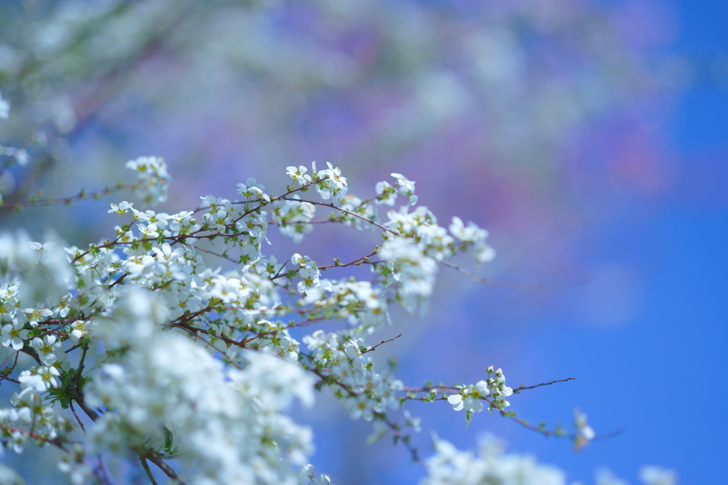 晴天の下、ユキヤナギのお花が咲いていたのでレンズを向ける。太陽は私の後ろから照っている。順光。