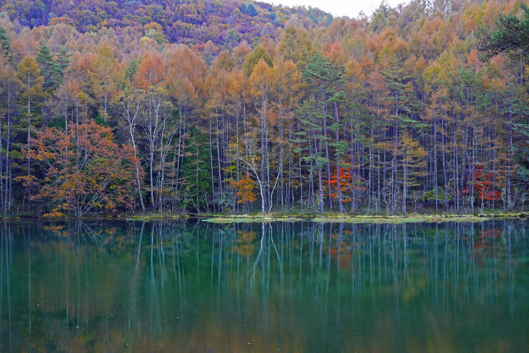 最初に訪れた場所は、東山魁夷が描いた「緑響く」のモチーフであり、テレビCMなどで話題なった絶景ポイントの「御射鹿池」。朝早くから多くの写真愛好家が撮影に来ていました。