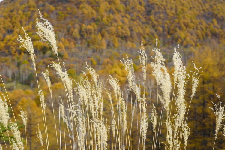 キレイに黄色くなっている唐松を背景にススキを撮ってみました。
