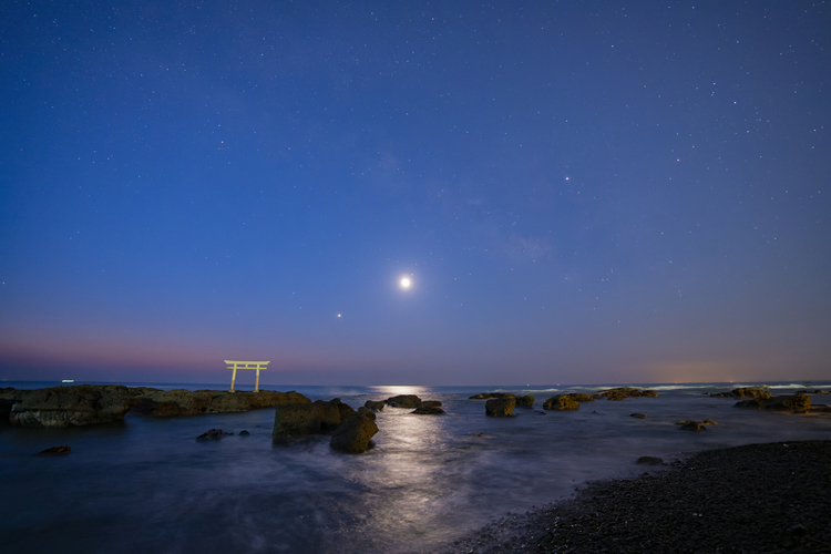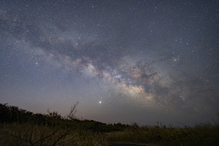 また、天の川が昇ってくる方角は東南から南になります。そのため、風景と一緒に撮影をする場合は、この方角に構図のアクセントになる被写体があることが重要になります。ロケーションハンティングをする際には、空が暗いところを探すだけでなく、方角も意識して行うようにしましょう。暗いところを移動することが困難な場合は、東南が開けている海岸線や展望台を探してみましょう。