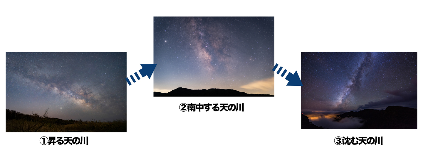 天の川は夏に撮るべきと思われがちですが、必ずしもそうとは限りません。大事なことは「どのような形の天の川を撮影したいか」を考えてから、撮影するタイミングを決めることです。天の川も他の星々と同じように、東の地平線から昇り、南へ移動し、西の地平線へと沈んでいきます。この一連の動きを理解し、どのような天の川を撮影したいかを決めることがスタートになります。