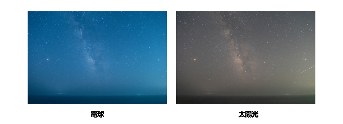 また、天の川を綺麗に撮影する上では、カメラの設定も重要になります。特に色温度は見た目の色合いだけでなく、天の川の存在感にも影響してきます。星景写真でおすすめな色温度は「蛍光灯」や「電球」などの少し青味が強い色温度ですが、天の川を少しでも濃く撮影したい場合は「曇天」や「太陽光」などの赤みが強い色温度を選択するのも手です。もちろん全体的な空の色合いも変わってくるため、これらの色温度を選びつつ、カメラ内で色温度の微調整を行いながら撮影するのがいいでしょう。