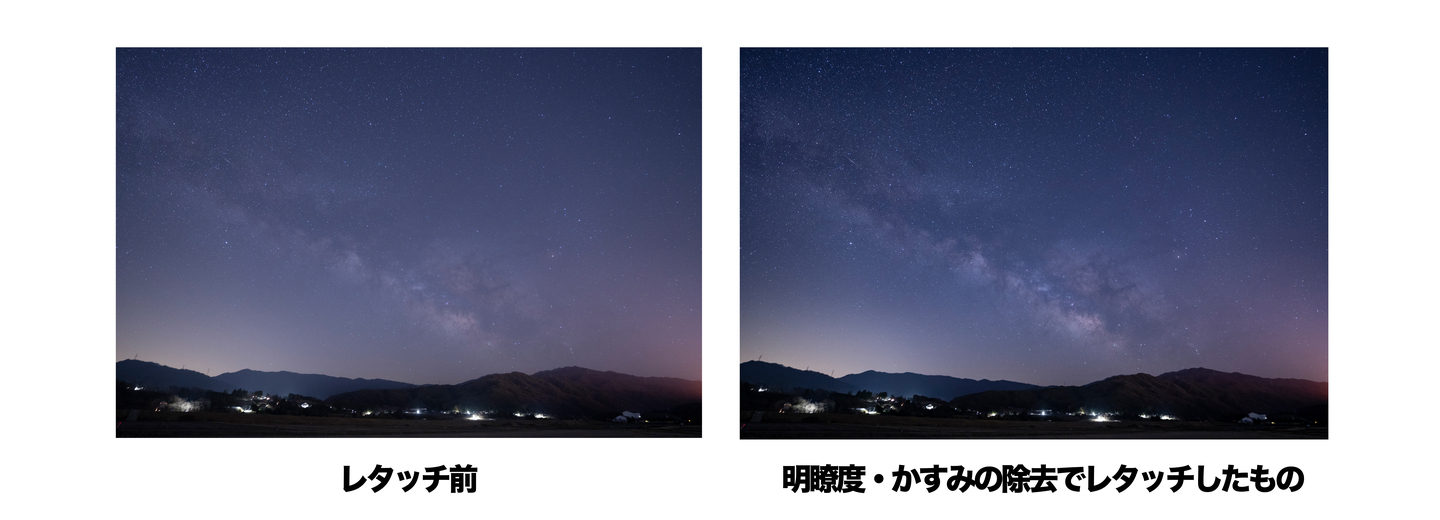 この2つは基本的に写真のコントラストを補正するパラメーターになりますが、コントラストを補正するのと同時に境界線のシャープネスも補正してくれますので、簡単に天の川の存在感を強調させることができます。CameraRAWは、パラメーターの変動に合わせてリアルタイムでレタッチ結果が反映されますので、ご自身の好みに合わせてパラメーターを操作してみましょう。RAW現像のより詳しい手順については、また別記事でご紹介したいと思います。