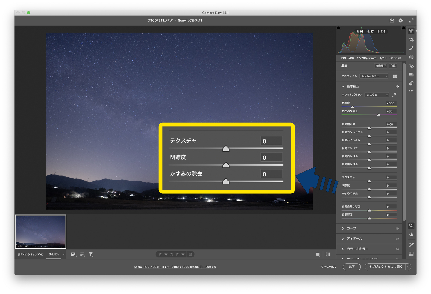 私はAdobe Photoshopのプラグインである「Camera RAW」を用いてRAW現像を行うことが多いのですが、これには天の川を簡単に濃くすることができる便利なパラメーターがあります。それは「明瞭度」と「かすみの除去」です。