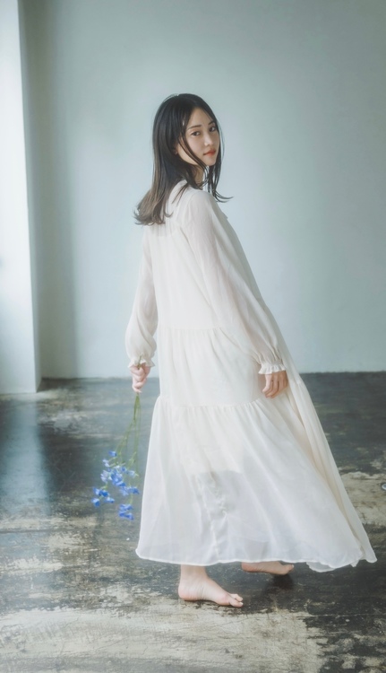視線、表情の切り取りにおいてはとても奥深くその視線一つで印象が決まり、表情は表現そのものを伝えるとても重要なものです。カメラ目線でも、永尾まりやさん特有の儚げな視線と言葉では表現出来ない雰囲気をしっかりと逃さないよう、この瞬間を切り取りました。撮影する際のポイントは、目の力などが自然と抜けた曖昧な瞬間を狙って撮影することを意識しています。
