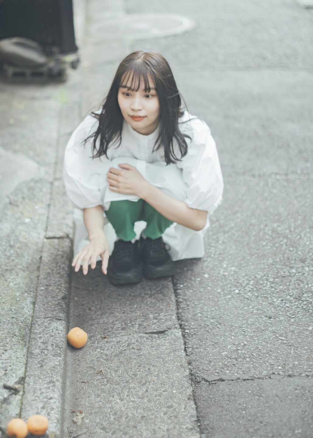 道端にたまたま果物が落ちていたので、拾っているような仕草をしてもらいました。これだけでもストーリー性が出て動きのある写真になると思うのですが、この写真への私のこだわりは、真横にあったオレンジ色の車を差し色として入れた事です。