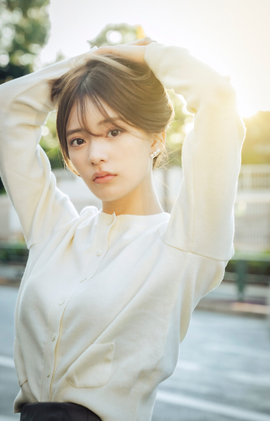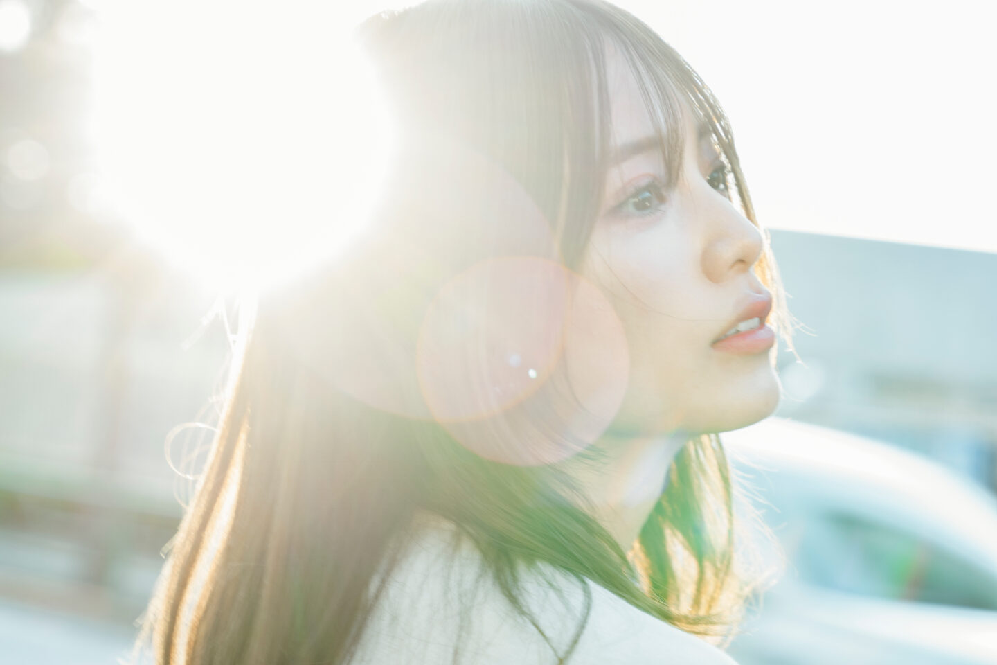 このシーンでは、髪の毛を持ち上げてもらい顔と腕の隙間からやさしい光が差し込むようなイメージで撮影しました。そして、写真全体的に抜け感を作る方法として、頭上と背景に見える道路を空間として捉えることで、シンプルかつ、まとまりのある写真になっているかと思います。