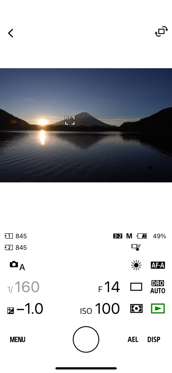 太陽が眩しくて富士山の方向やモニターを見るのが辛いのですが、リモート撮影すればスマホの画面を見ながら撮影できるので目を痛めることもありません。