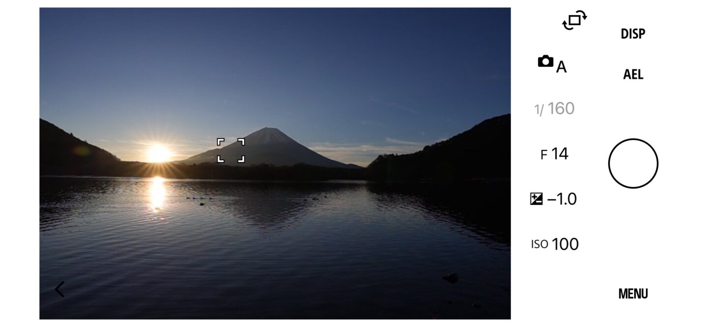 Creator’s Appの場合はスクリーンショットに表示されているフォーカスポイント、撮影モード、ISO感度、ホワイトバランスなどカメラの基本設定はほぼ全て設定できます。さらにMENUを開くとその他ほとんどの機能も設定する事ができます。