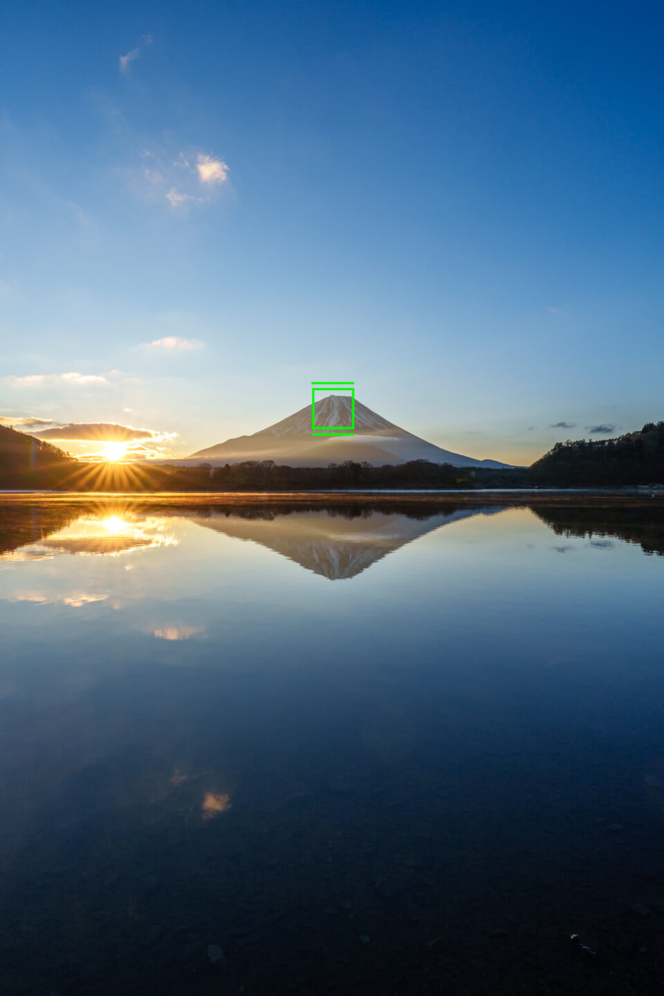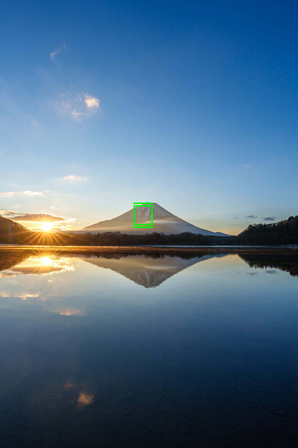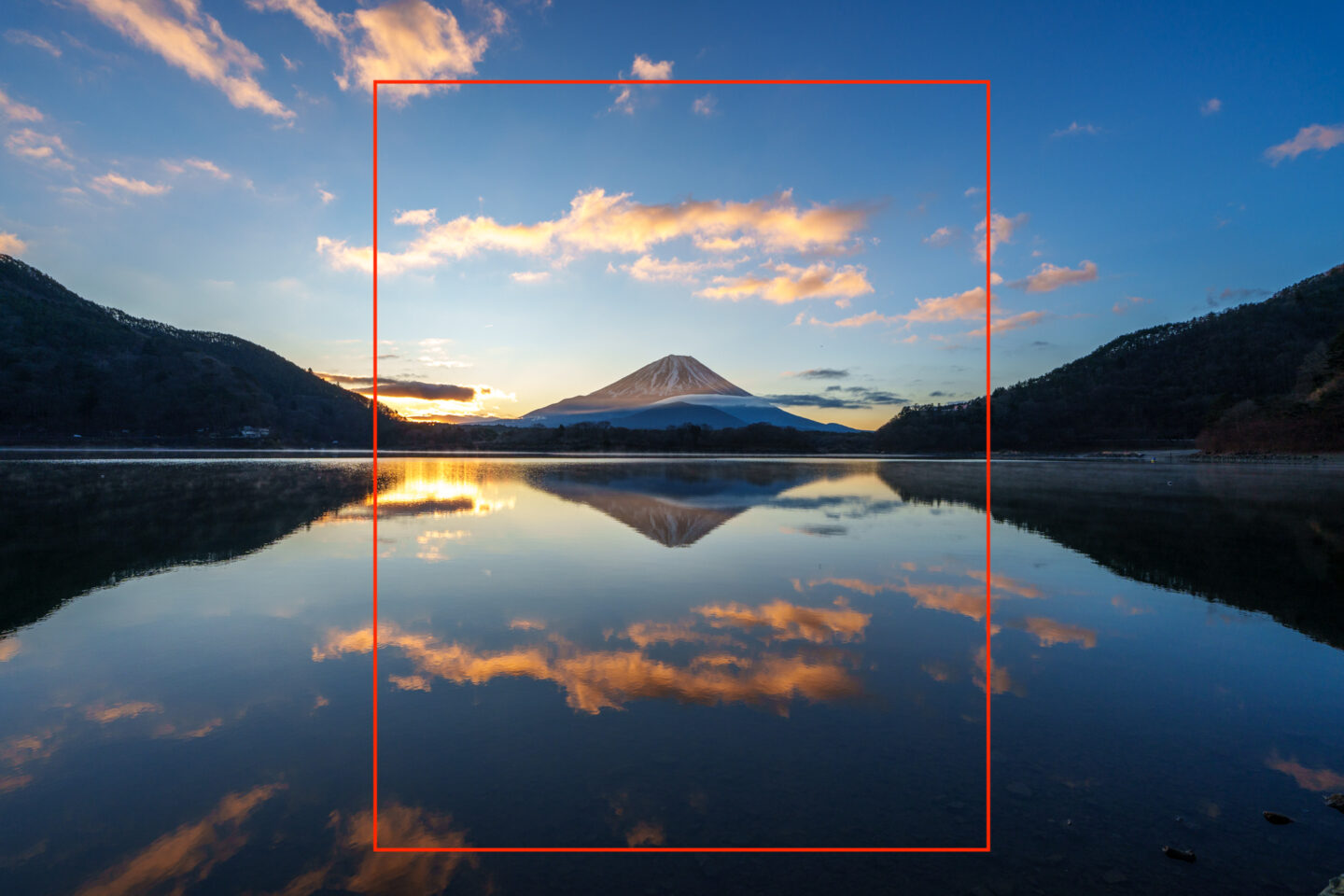 逆さ富士が綺麗だったので、最もバランスが良くて歪みも少ない日の丸構図で撮影しました。額装して飾るのに良いかもしれませんが、スマホの待ち受けや年賀状には使いにくい構図です。