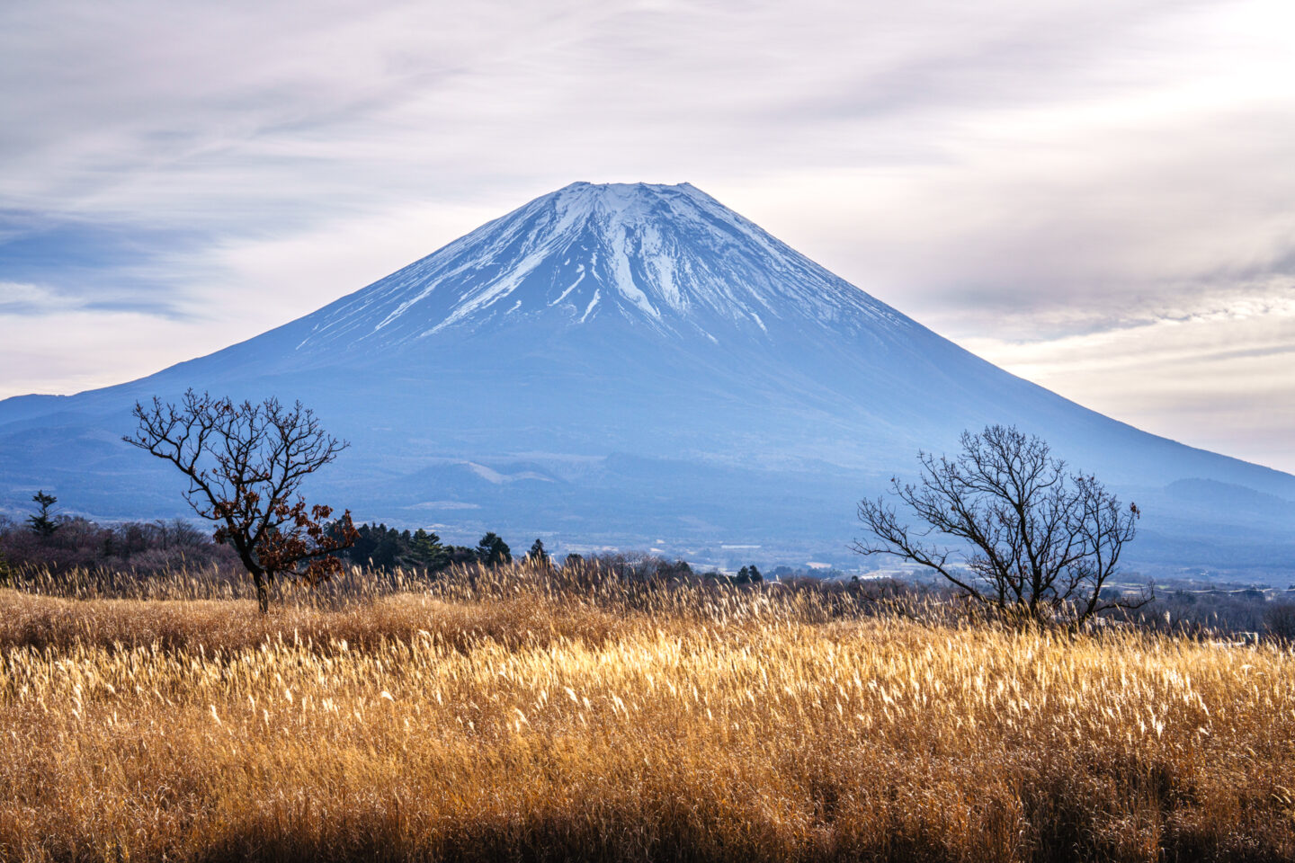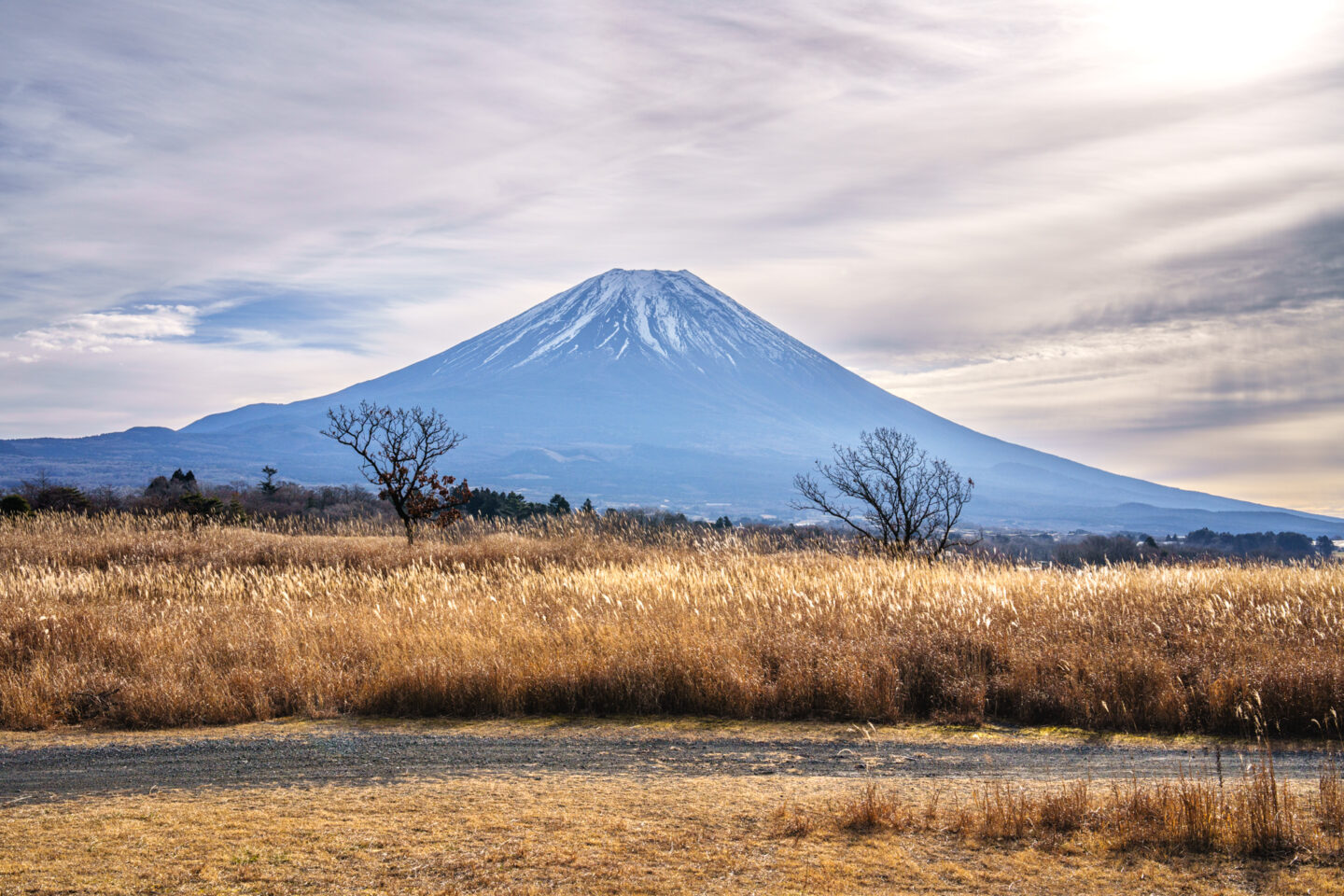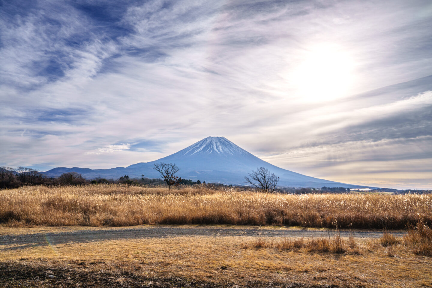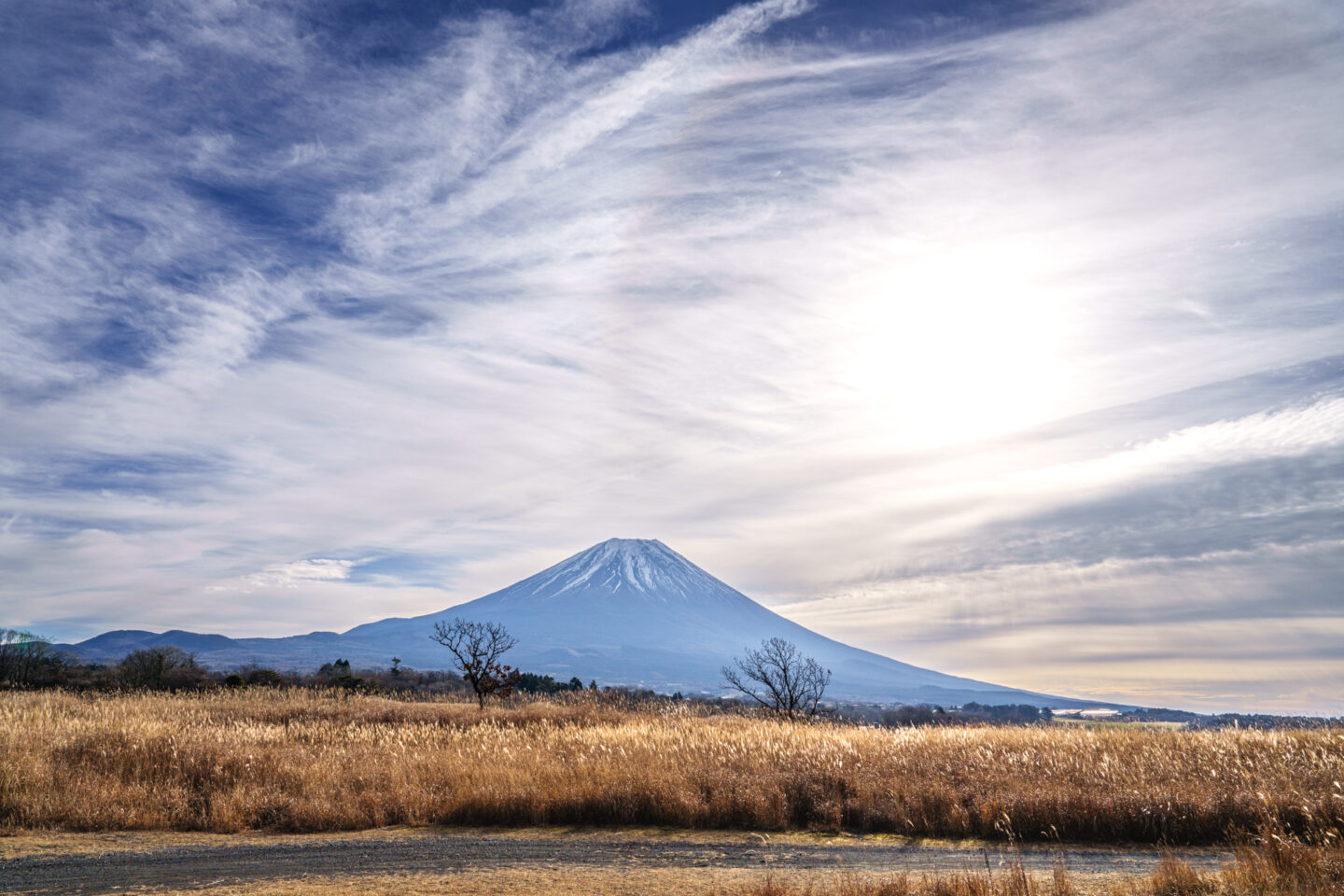 広い高原の中で富士山を背景に輝くススキと2本の木立が印象的だった部分を切り取ります。