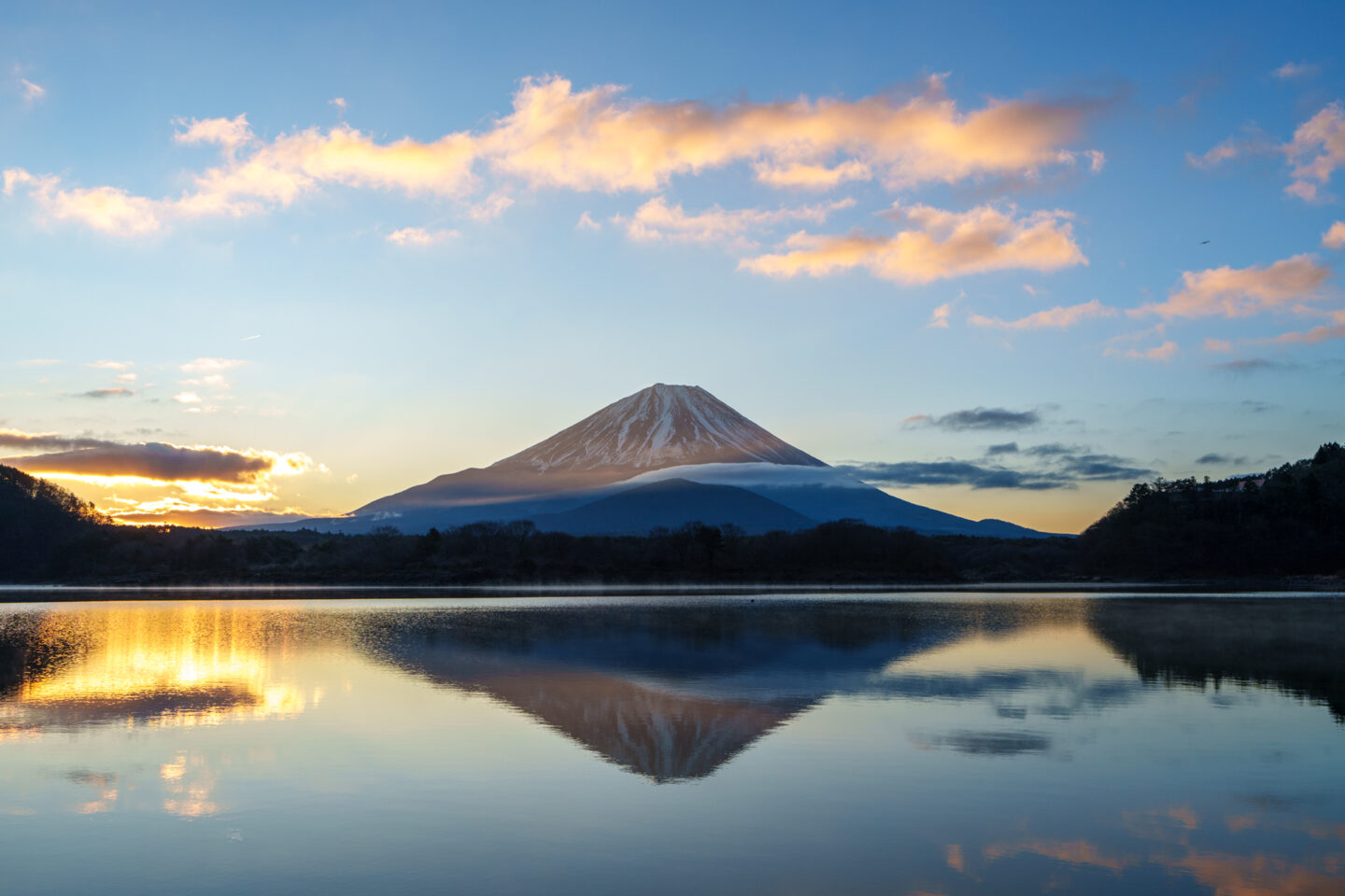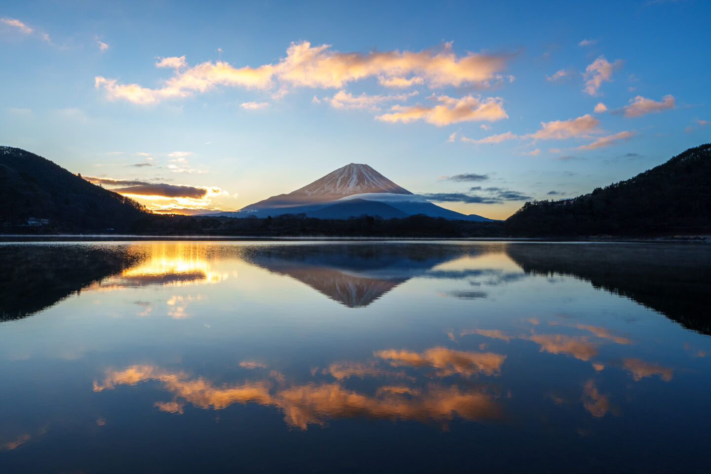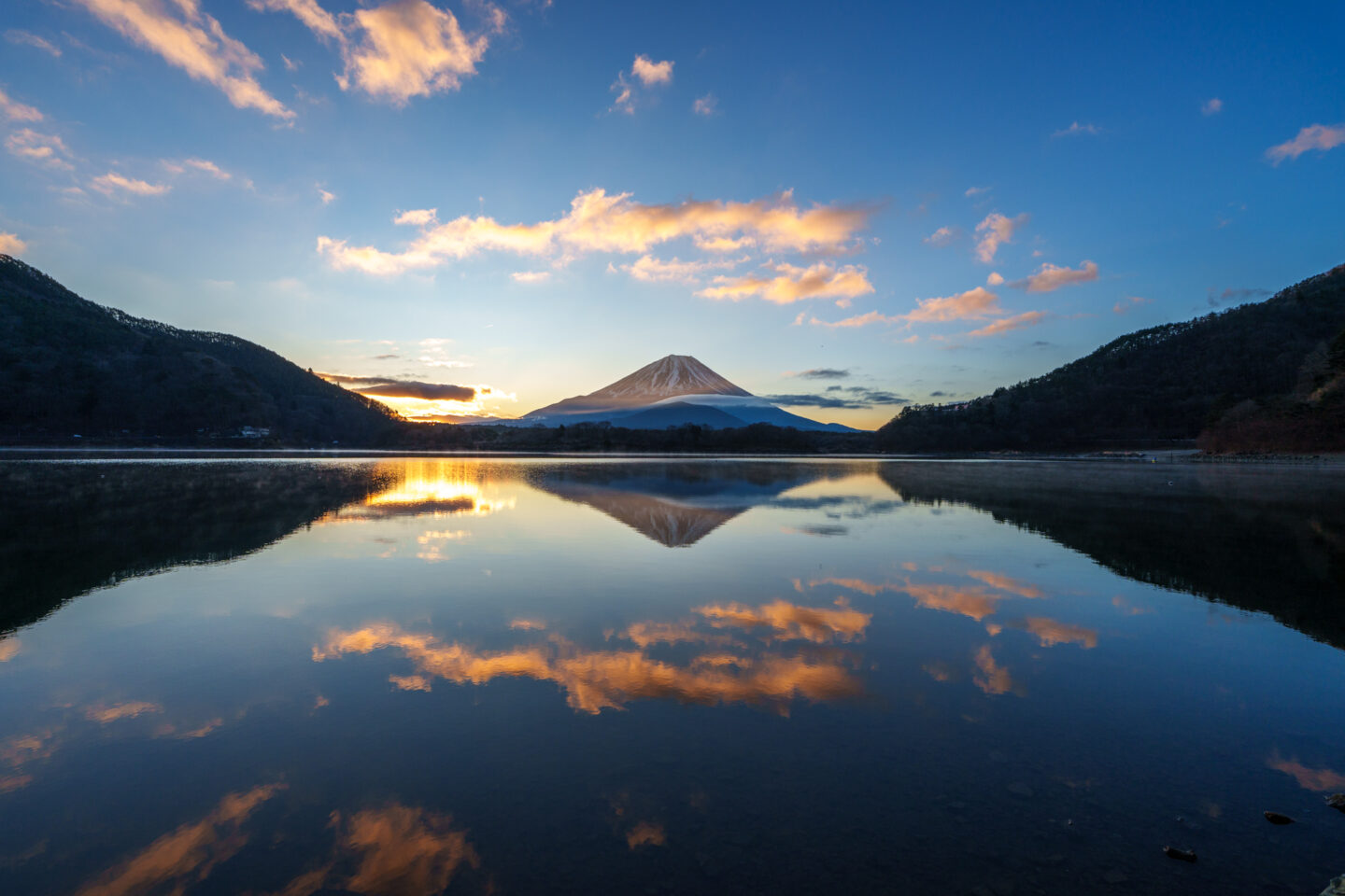 この一枚は完璧な逆さ富士と朝日で雲が色付いている場面を撮影したものです。