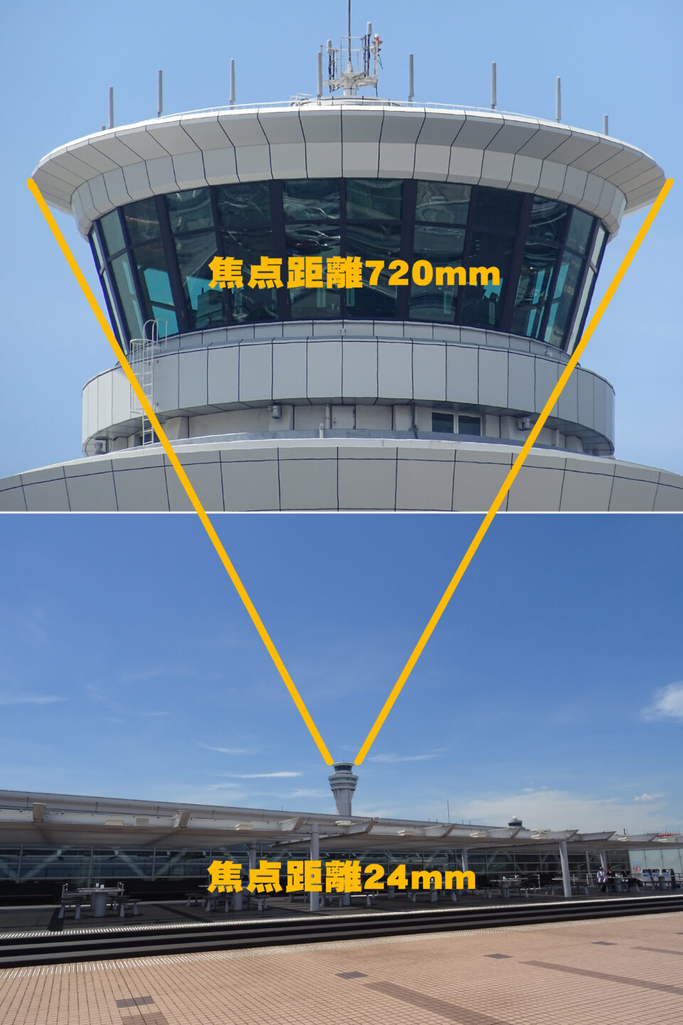 下の写真は、羽田空港の展望デッキから管制塔を、ワイド側24mmと望遠側720mmで同じ場所からズームして撮影してみたものになります。小さなボディで驚くほどアップで撮影する事ができます。普段使いの便利なスマホでは、ここまでの望遠はできないので大きなアドバンテージになります。