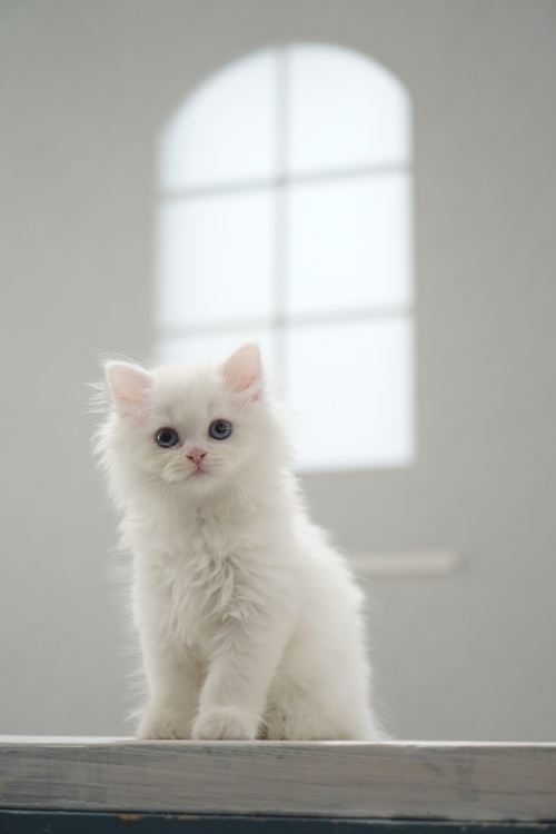 形が印象的な窓を背景にして撮影。窓の全体が写真に入るくらいに窓とにゃんこの距離を離して撮影しました。窓からの光がにゃんこを優しく照らし毛の輪郭がキラキラと輝いています。