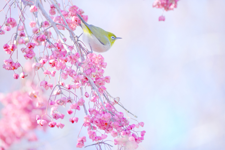 冬。まゆみの木の実の種を食べにやってくるメジロ。
