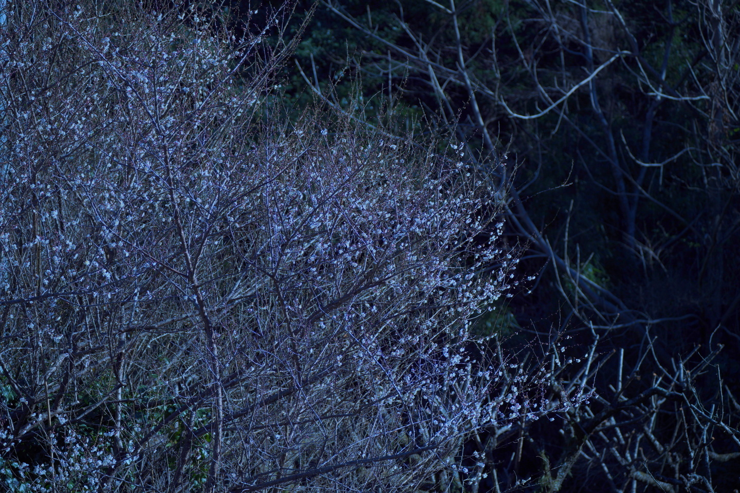 日中、暗がりの中に雪のように咲く梅林を撮影。